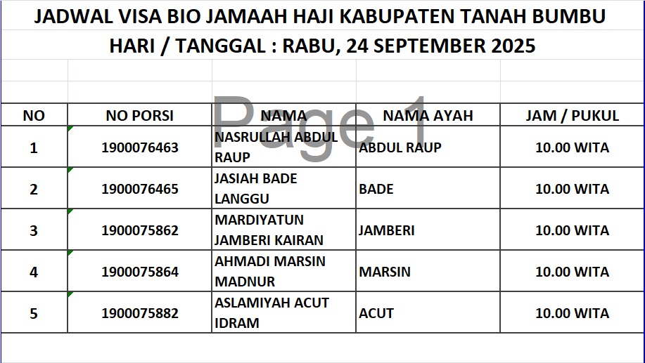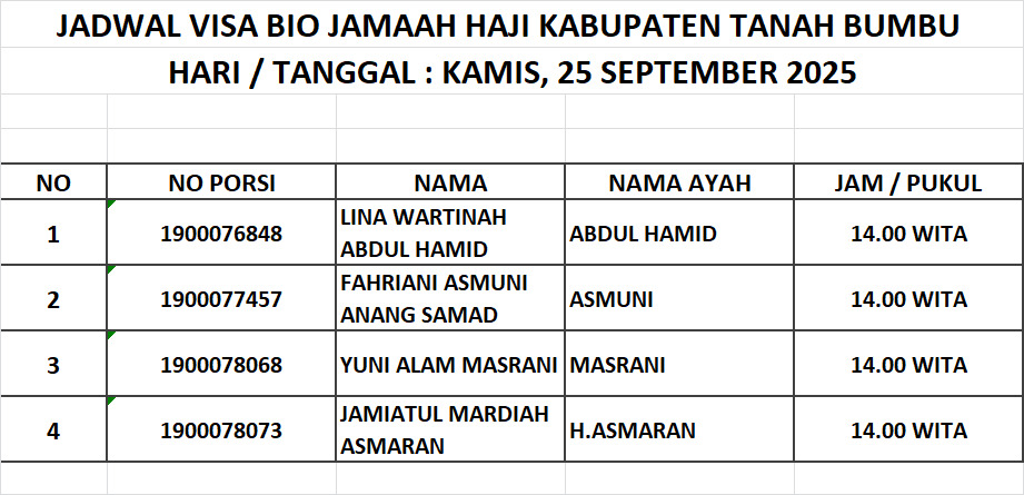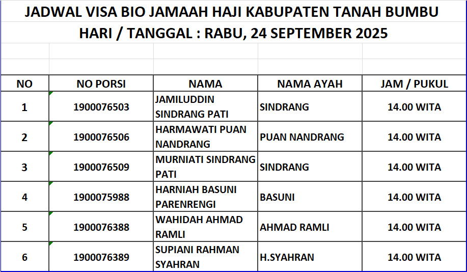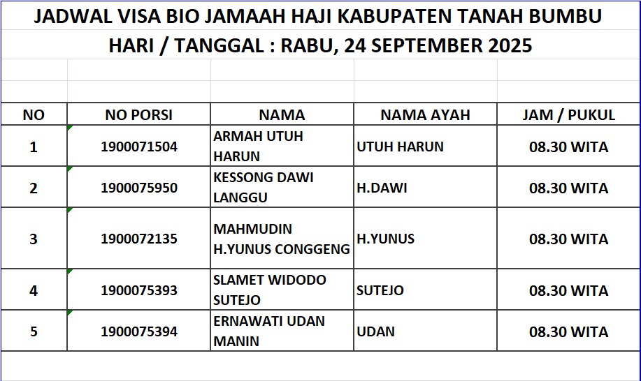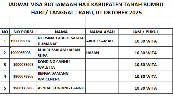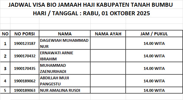 Jadwal Visa Bio Jamaah Haji Kabupaten Tanah Bumbu 1447H / 2026M Admin PHU Oct 12, 2025 0 Komentar Jadwal 2026 M 1447 H Jamaaah Haji Share: