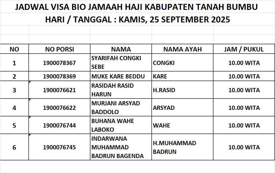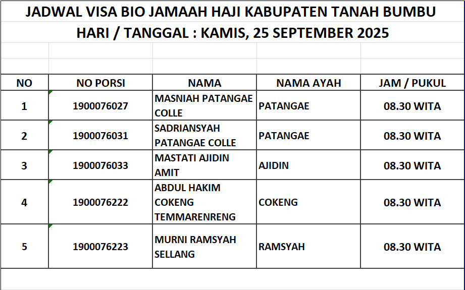Jadwal Visa Bio Jamaah Haji Kabupaten Tanah Bumbu 1447H / 2026M Admin PHU Oct 12, 2025 0 Komentar Jadwal 2026 M 1447 H Jamaaah Haji Share: